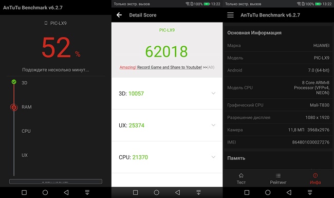 Процесорът Kirin 659 е разработен от компанията Huawei. Тук марката няма да изостави собственото си развитие и да купи чипсети от други производители. За средния телефон процесорът работи добре, в Antutu спечелвайки 60 хил. точки, Игрите се изпълняват на средни настройки без никакви проблеми изобщо. Тежките графични игри при високи настройки могат да бъдат малко бавни, но грешката отново е паметта. приспособление не се нагрява при зареждане, игри и други процеси. Резултат - 4/5.