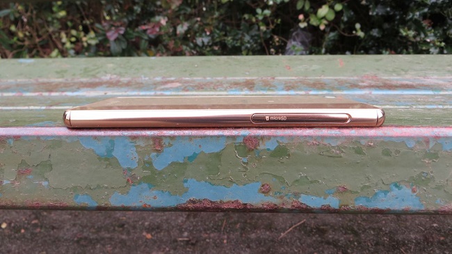 Познатият кръгъл ключ за захранване е инсталиран от дясната страна, има приятен завой. До прозореца за регулиране на силата на звука, както и клавиш за управление на клавиша.От лявата страна под гумените съединители за SIM картата и картата с памет. На върха има микрофон и жак за слушалки. В долната част на съединителя за свързване microUSB. Тук е инсталиран високоговорителят.