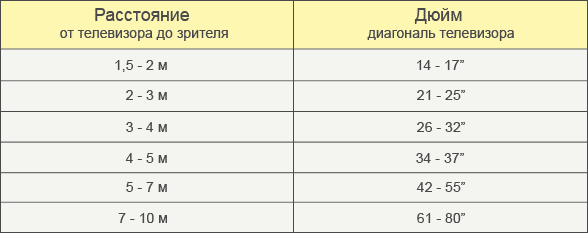 Намирането на правилния телевизор за стая обикновено отнема повече време, но ако знаете точната таблица с размери и вземете предвид зоната на стаята, можете да получите правилната опция много по-бързо. Правилно избраният LCD телевизор няма да причини зрително увреждане и ще зарадва собствениците си в продължение на много години. За да се опрости изборът, бе разработена специална таблица, с помощта на която можете бързо да намерите своя собствена версия на размера на дисплея. Изчислените данни са осреднени и е допустимо малка настройка в рамките на 30-50 см. В същото време не трябва да забравяте за дизайна на стаята и да мислите предварително кога точно ще бъде вашият телевизор. LCD панелът може да бъде монтиран на стената. Таблицата, сравняваща диагонала на телевизора и разстоянието до него от зрителя, е както следва: