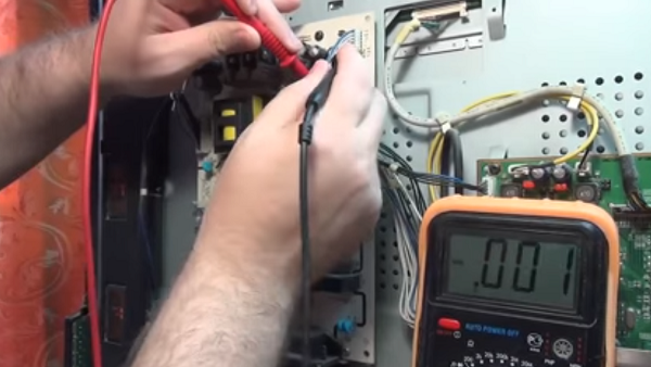 - След това една сонда за тестер може да бъде прикрепена към тялото на устройството, а другата към предварително избрания контакт и да измерва напрежението, като включи телевизора в мрежата. В този случай устройството показва 1,5 V, вместо необходимите 5 V. Тези показания на трансформатора показват, че той работи, но не и при пълна сила.Причината може да бъде изсушен кондензатордолу или подути - над трансформатора.