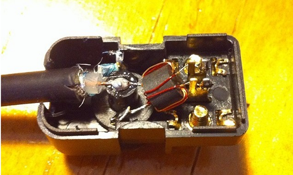 - Кабелът трябва да бъде залепен към контактите на намотката, както е показано.