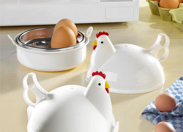Домакините са популярни в съда за готвене на яйца в микровълновата печка, направена под формата на пиле: удобна за използване и изглежда красива.