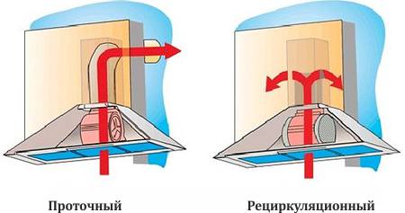- рециркулация тип се използва както за вградени, така и за монтирани устройства. Принципът на действие на такива устройства е филтриране на въздуха. Парата и неприятните миризми се абсорбират от качулката и преминават през филтърна система. Механизмът включва два етапа: първият филтър на вътрешния резервоар привлича тежки частици (грес, сажди, дим), а вторият, въглища, пречиства въздуха, премахвайки неприятната миризма.