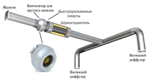 Вентилаторът за отработените газове е с ниско ниво на шум и висока мощност, Той може да изпомпва въздух от помещенията чрез мрежа от павирани канали. Въздушните канали (могат да бъдат кръгли или квадратни) обикновено се поставят под тавана и се скриват от кутия от гипсокартон или фалшив таван.
