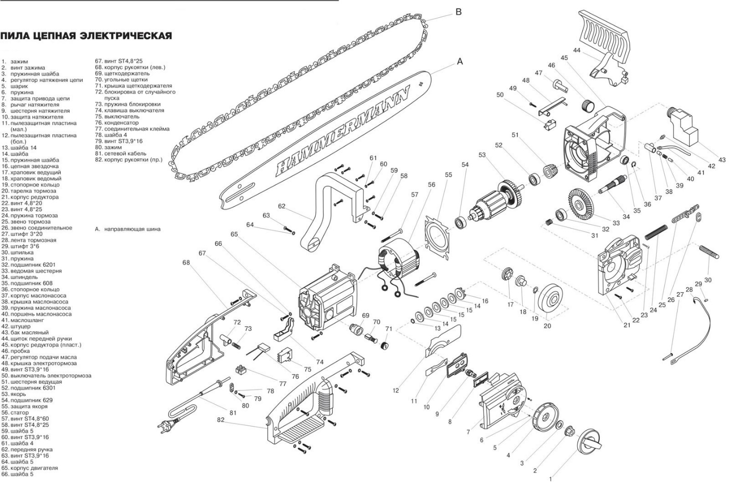 Започвайки да ремонтирате верижен трион, е необходимо да извършите последователна диагностика на всички единици на уреда, за да определите причината за разрушаването. Ремонтът на уреда се извършва въз основа на посочените по-горе симптоми на неизправност. По - долу е моторен трион, който показва подробно вътрешната структура на единицата.