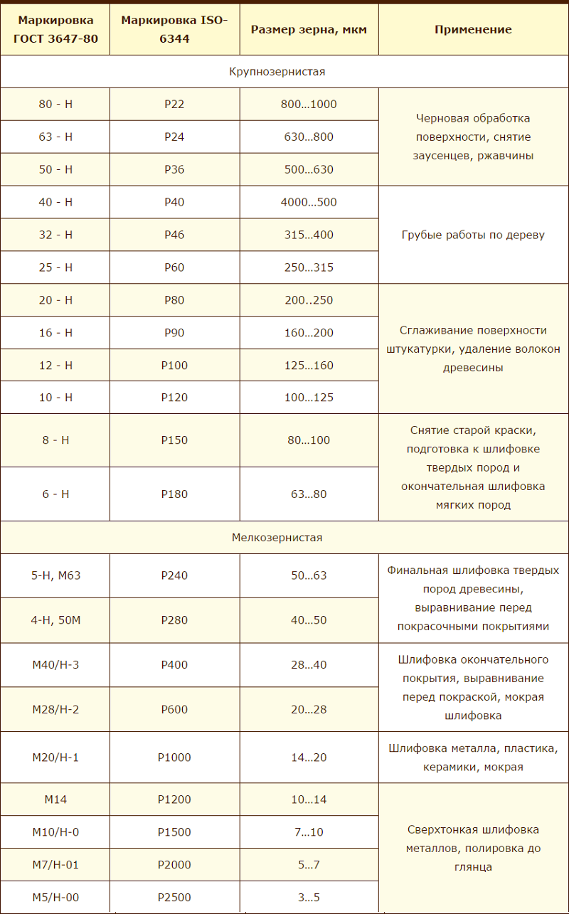 На всяка шлифовъчна хартия маркирана маркировка, показваща концентрацията на абразив и неговата фракция. Ако разчитате на вътрешния GOST 3647-80, то той показва колко абразивни зърна са на квадратен метър. Тези определения са остарели днес, тъй като новите международни стандарти (ISO). Съответно те са отбелязани на гърба на продукта. По-долу е дадена таблица, която изброява всички видове зърно, както за GOST 3647-80, така и за ISO.