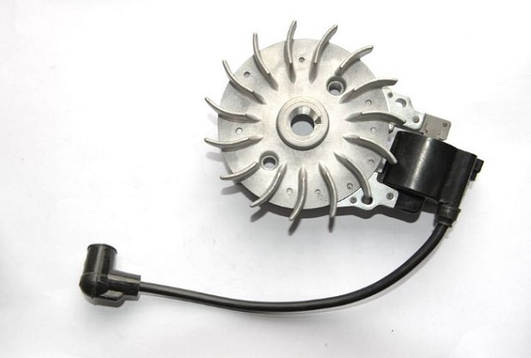 Двутактовата система за запалване на двигателя се състои от 2 елемента: маховик и намотка (магнито). Фигурата по-долу показва как изглеждат.