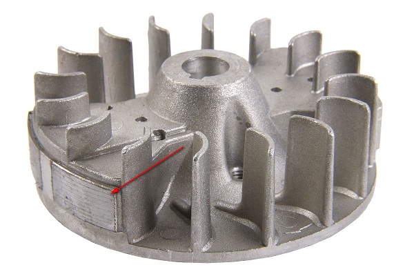 На маховика е работно колело, което работи като вентилатор за охлаждане на двигателя. Също от едната страна на маховика са постоянните магнити, фигурата показва стрелката.