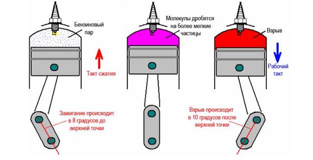 Искусът в свещта трябва да се появи в момента на компресиране на горивото от буталото, когато то не достига най-горния мъртъв център (TDC) само малко. Когато буталото преминава през ТДВ, горивната смес се запалва, причинявайки буталото да падне под действието на енергията на експлозията.
