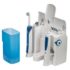 Така че пред нас има солидна централна сграда, над която двете дръжки на четка и иригатор се издигат над две върхови кули. център работи от основния променлив ток, но е оборудван с безконтактно зарядно устройство за зареждане на четка за зъби. В центъра на корпуса има табло, което отговаря за работата на напоителната система (дисплей, бутон за захранване и бутони за регулиране нивото на налягане на флуида). Управлението на четката за зъби се намира на дръжката.