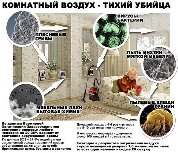 В дома, дори при нормално почистване на помещенията, във въздуха може да има маса от алергени, които дразнят лигавицата на горните дихателни пътища и очите: