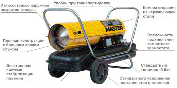 - Вентилатор за топлина дизелов тип Master V70CED. Устройството не е оборудвано с газово изпускателна система или Master Vas77e. Тези модели се характеризират с непряко отопление и ниска консумация на енергия.