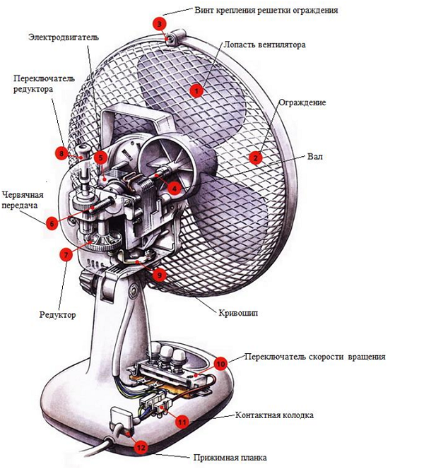 Вентилаторът на домакинството не се отличава със сложността на дизайна, а принципът на устройството му може да се види на фигурата по-долу.