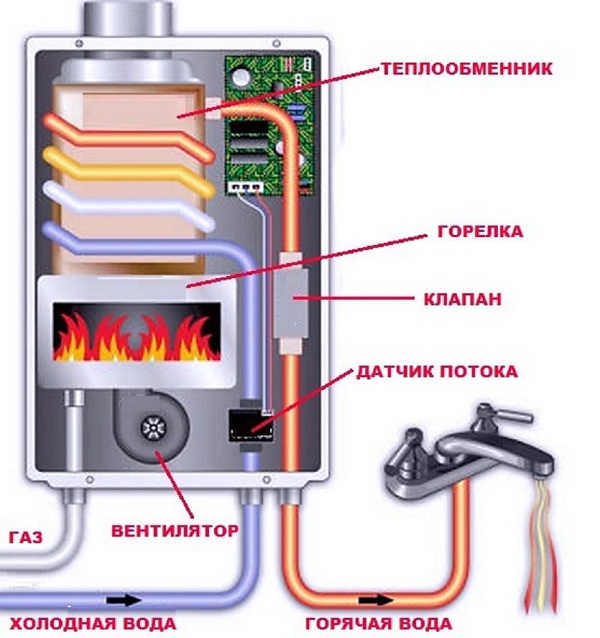- Газ. Този тип колона се нарича поради големия капацитет с течност. Системата е най-икономична за работа, но са необходими специални условия за монтаж (отстраняване на продуктите от изгарянето чрез комин, място за монтаж).По време на работа е необходимо да се спазват мерките за пожарна безопасност.