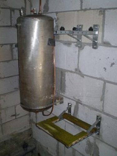 - Готовият електрически бойлер е монтиран на стената с скоби.