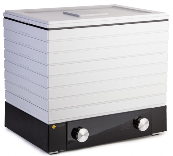 Друг претендент за заглавието на най-добрия модел на дехидратори 2016-2017 година. На първо място, този модел е ярък и необичаен кубичен дизайн и прилича на музикално устройство с контрол на силата на звука. Ергономичният външен вид, без да крещят дизайнерските елементи, ще позволи на устройството лесно да се впише в почти всеки интериор. Средната цена за устройството е в диапазона 13500 r. Принципът на сушене е традиционен, конвективен. Максималната мощност от 530 вата. Доставката идва с до шест палети, както и четири течни буркани. Полезен обем от 24,2 литра. Електронният контролен модул има възможност да регулира температурата в диапазона от 35 до 70 градуса. Палетите са направени в същия стил с тялото - изработени от непрозрачна пластмаса, с регулируема височина.
